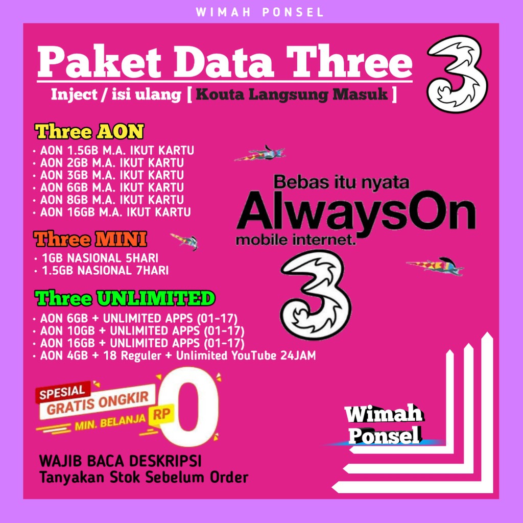 Voucher inject masa aktif 1 tahun kartu 3/tri/three. Inject untuk kartu tri download disini atau disini port inject 9999; Cara daftar paket add on tri 1 tahun. Akun ssh premium yang aktif; Ada beragam pilihan kuota yang tersedia dalam paket add on mulai dari 300 mb hingga 38 gb. Buka aplikasi message pada smartphone anda; Cara inject kuota kartu perdana . Kirim pesan dengan format (16 digit nomor nik)#(16 digit selesai, cukup mudah memang cara registrasi kartu 3 . Kuota dapat digunakan untuk akses aplikasi dan situs edmodo. Cara inject kuota murah kartu 3 tri : Manfaat dan masa aktif perdana alwayson: Alwayson, paket data yang memungkinkan pelanggan menikmati kebebasan berinternet dengan kuota yang aktif sesuai dengan masa aktif kartu, . Cara registrasi dengan kode dial :